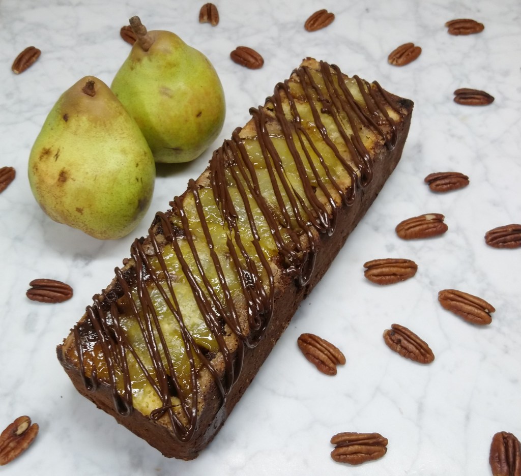 Wat heb ik er uiteindelijk mee gedaan? De originele appel in het recept heb ik vervangen voor peren, welke ik na het schillen door de roompoeder heb gehaald. De hoeveelheid suiker en boter voor de vulling heb ik verlaagd en de kristalsuiker vervangen voor basterdsuiker. Ook heb ik ervoor gekozen om aan het cakebeslag cacaopoeder en nesquik toe te voegen omdat een chocoladesmaak me hier heerlijk bij lijkt. De maïzena heb ik vervangen door roompoeder (of custardpoeder) en de pecannoten gaan door de vulling in plaats van bij de peer. Tot slot heb ik de Turf met wat pure chocolade gedecoreerd.