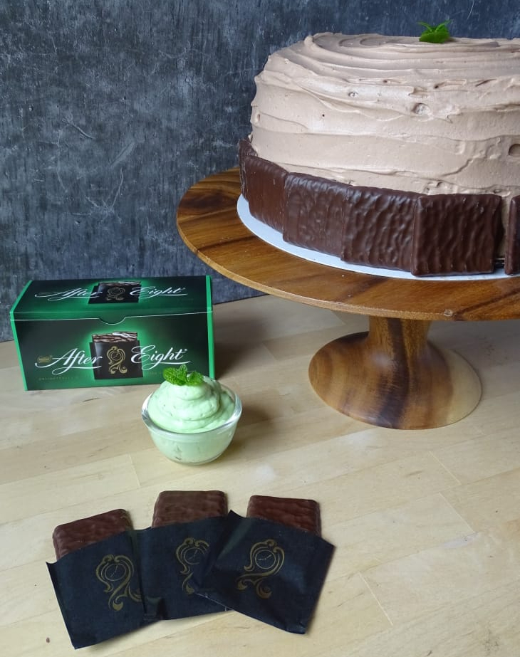 Als je de taart niet koelt, loop je het risico op een wiebelige taart het uiteindelijke afsmeren, wat vaak een slordig eindresultaat geeft. Als de taart gekoeld is, is het tijd om deze helemaal in te smeren met een laag chocolade crème chantilly. Gebruik eventueel een taartschraper of groot paletmes om de taart mooi strak te maken aan de buitenkant. Ook kun je er vor kiezen om juist een soort patroon of een golfslag aan te brengen. Ik heb dit keer voor de laatste optie gekozen. Als je de taart volledig hebt bedekt is, druk je de After Eight chocolade mints tegen de onderkant van de taart en gaat hiermee helemaal rond. Je kunt ze iets laten overlappen voor een leuk vouw effect. Als laatste een topje muntblad en ik zit klaar met mijn kop thee; tijd voor een punt taart!.